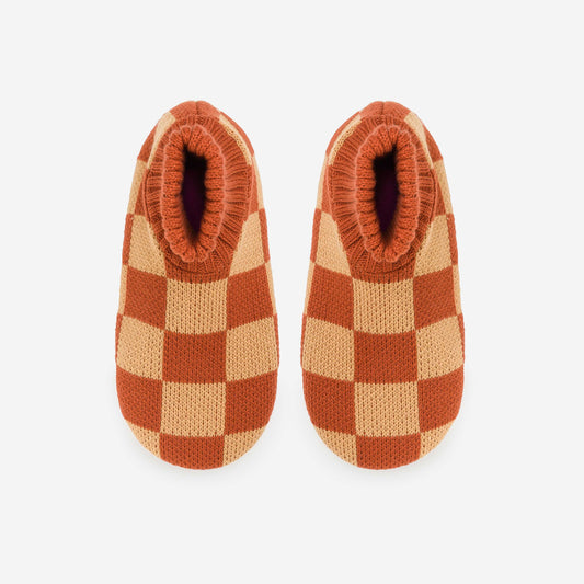 • Checkerboard Knit Sock Slippers in Rust Camel