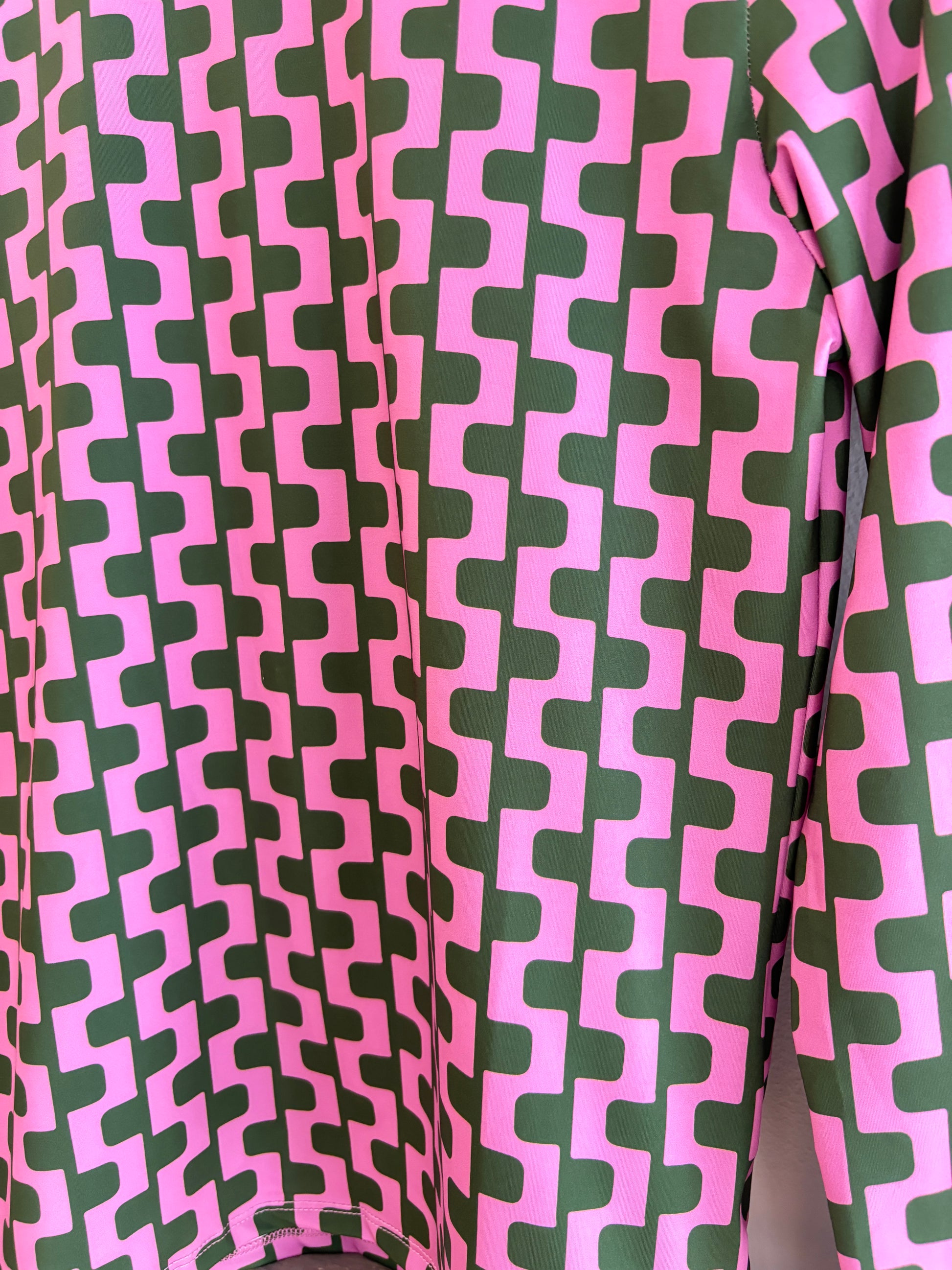 Close-fitting mock neck long sleeve shirt featuring an eye-catching lilac and green geometric sublimation print.